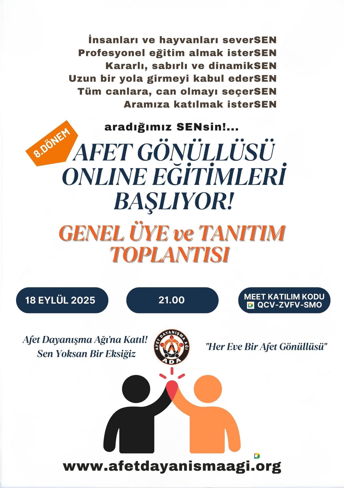Afetlere karşı dayanışmayı büyütmek, toplumun birlikte hareket edebilme kapasitesini artırmak ve olası kriz anlarında doğru müdahaleleri yapabilmek için Afet Dayanışma Ağı olarak gönüllü eğitimlerimizin 8. dönemine başlıyoruz.