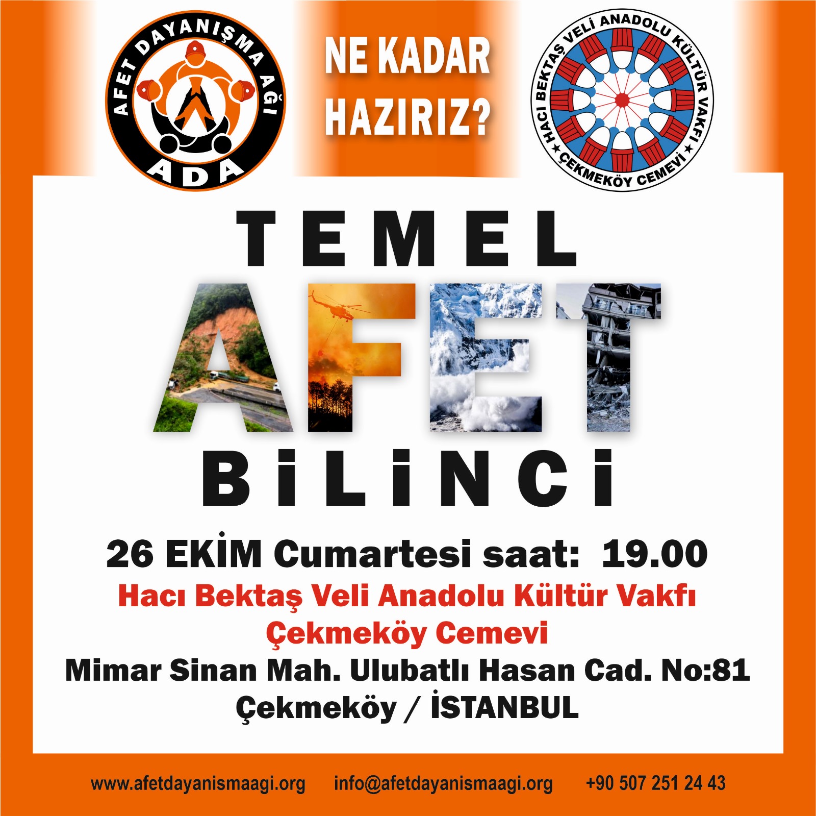 Ülkemiz aktif fay hatları üzerinde bulunan bir deprem ülkesidir. Geçmiş yıllarda hazırlıksız olmanın bedelini maalese acı tecrübelerle yaşadık .Çekmeköy Cemevi ve Afet Dayanışma Ağı ile beraber ortaklaşa #temelafetbilinci adı altında yapacağımız seminerimize tüm halkımız davetlidir.