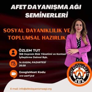 Afet Dayanışma Ağı ekibi olarak düzenlediğimiz seminerler online veya yüz yüze olarak yapılmakta olup; konusunda uzman konukların konuşmacı olarak katılım sağladığı oturumlardır.