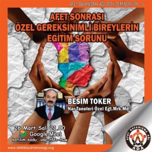 Afet Sonrası Özel Gereksinimli Bireylerin Eğitim Sorunu / Besim Toker – https://drive.google.com/file/d/1XCqKSo-T6ZdTRi0wx3Z_wHyfteKrdndQ/view?usp=drivesdk